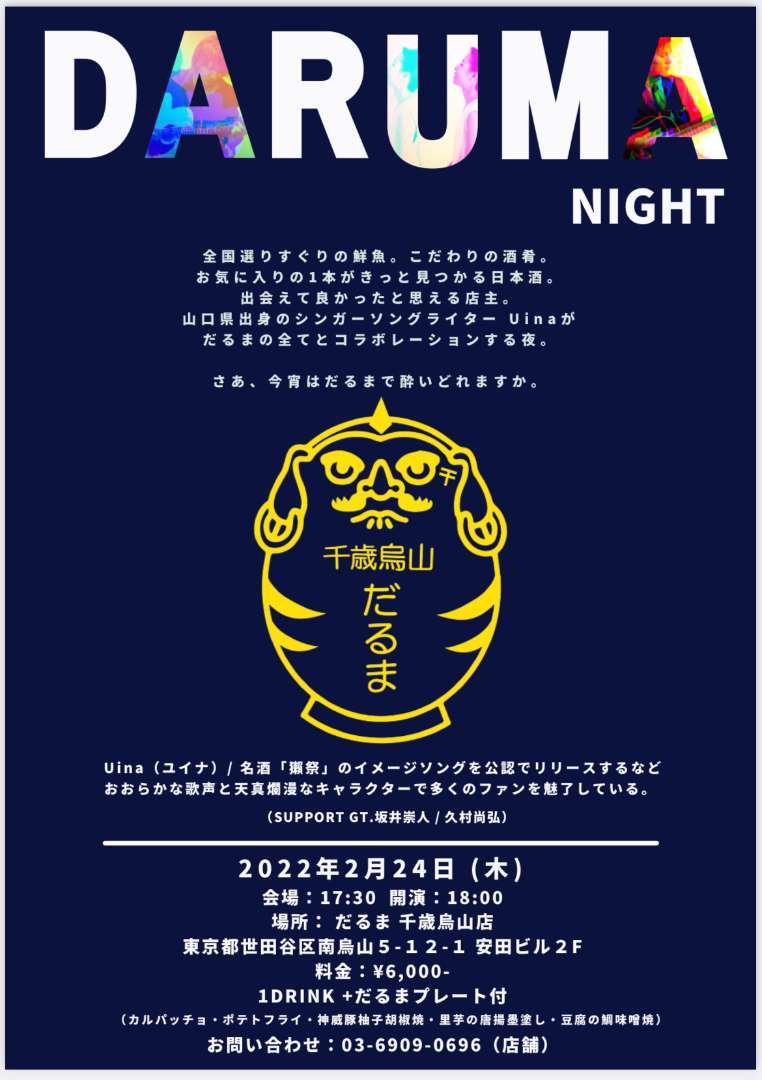 来たる、2/24(木)18:00~ だるま千歳烏山にて行われる、その名も「だるまナイト」そのまんま。。ですが。。出演アーティストのご紹介です。Uina(ユイナ)さん