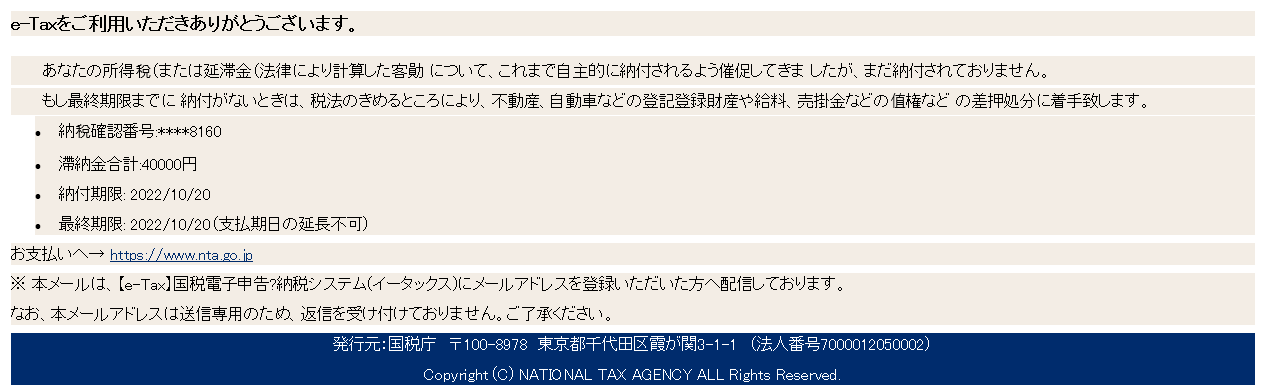 国税局。。でURLの先にはchinaの文字が。。なんでこんな世の中になってしまったのですかねぇ。。国税局のHPでも次のように注意喚起していました。「国税局・税務署をかたった不審なメールにご注意ください最近、次のような国税局・税務署をかたった不審なメールが送信されております。国税局・税務署では、電子メールで納税に関する催告を行っておりません。指定されたURLをクリックしないようお願いします。」次から次へと、色んな事を考えるモノです。。その努力をもっと違う所に使いなさい!!! とにもかくにも、皆様もお気を付けください。