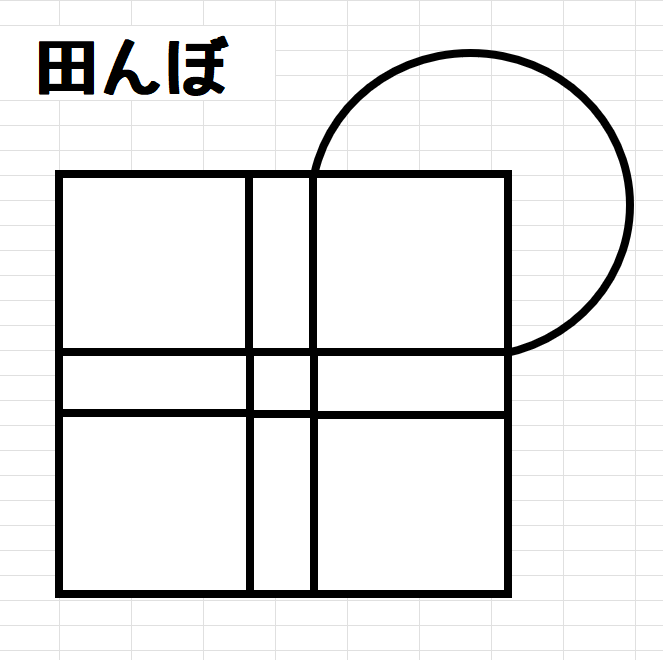 屋外で、小学校の休み時間に校庭でみんなやってたのが「田んぼ」です。校庭のあちらこちらにこの図が描かれていたものです。こいつは各地方で様々な呼び名やルールがあるみたいですが、さがみっぱらはこんな感じでした。〇の所からスタートし1周するゲーム。オニがあぜ道の中からタッチしたらオニになります。田んぼの外は3歩まで可、地に付かなければ1歩になりませんので、何人かが途中に留まり、その靴の上を通ったり。オニも数人になると協力して目いっぱい身体を伸ばしてタッチ。何か色々思い出してきました。。田んぼは決着が早くつくので、休み時間にピッタリでした。このあぜ道を大きな子の肩につかまりダラーンとつま先立ちで歩きながら描く光景が懐かしい。。ちなみに上図は自作です。。