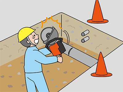 またまた不幸な事故が起きました。詳細は分かりませんが、キックバックでしょう。 対象物に切り込みを入れるときは、キックバックと呼ばれる現象の影響を避けるために、必ずコンクリートカッター(エンジンカッター)の隣または斜め後方に立ちましょう。キックバックとは、作業中にカッターが切断できないものに接触したり、カッターの回転が急に妨げられたりしたときに、コンクリートカッター(エンジンカッター)が突然自分の方に跳ね返ってくる現象です。 最悪の場合死亡事故につながる恐れもあるため、キックバックが起こりうることを念頭に置いて、厳重な注意のもと作業を進めてください。