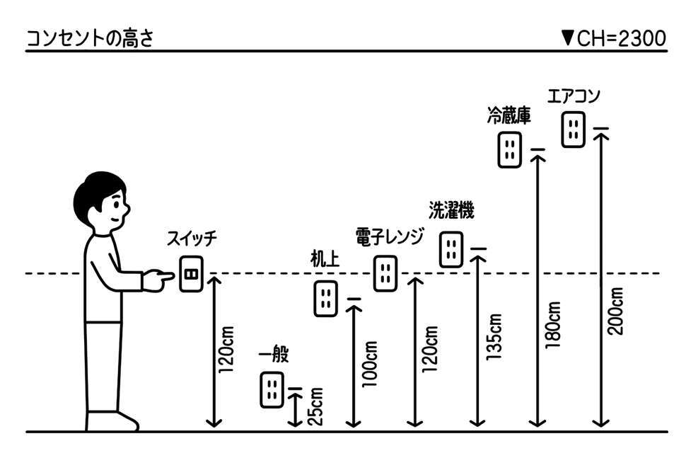 他にもコンセントに纏わるお話しは多岐に渡ります。こちら一般的なコンセント類の高さの目安です。特に見落としがちなのが机上。賃貸物件はひとまず置いといて。ご自宅新築などの際には是非とも考慮いただきたいのが机上コンセント位置です。机といっても書斎からダイニングまで色々あります。書斎や子供部屋にはPCその他のモバイル充電機器が多数あるでしょうし、ダイニングでお仕事PC・お子様の勉強用タブレットを使う事もあるでしょう。スマホの充電もしたいところです。ホットプレートを使ってのタコパやBBQも楽しいですよね。そんな生活スタイルの中、今や机上のコンセントは必須アイテムです。他にもTV周りには、DVD・ゲーム・ルーター・HDDなどなど多数の電気機器が集まってきます。キッチンも同様。炊飯器にフードプロセッサー・コーヒーメーカーにトースター。コンセントがいくつあっても足りません。。このように間取りや内装に拘るのと同じ位コンセント計画は重要なポイントです。夢のマイホームがタコ足配線だらけになったり、ブレーカー落ちまくったりしないように。コンセント計画もしっかり行っていきましょう。 と、同時に毎日ニュースになる、何も考えずに闇バイトに関わる若者?にもしっかり教育をしないといけませんね。どうせやるなら完全犯罪を目指して欲しいのですが、行き当たりばったりのアホばっかりで困ります。。同世代の子供を持つ身としては遣る瀬無さを感じる今日この頃。。本日もくれぐれもご健康でご安全に。