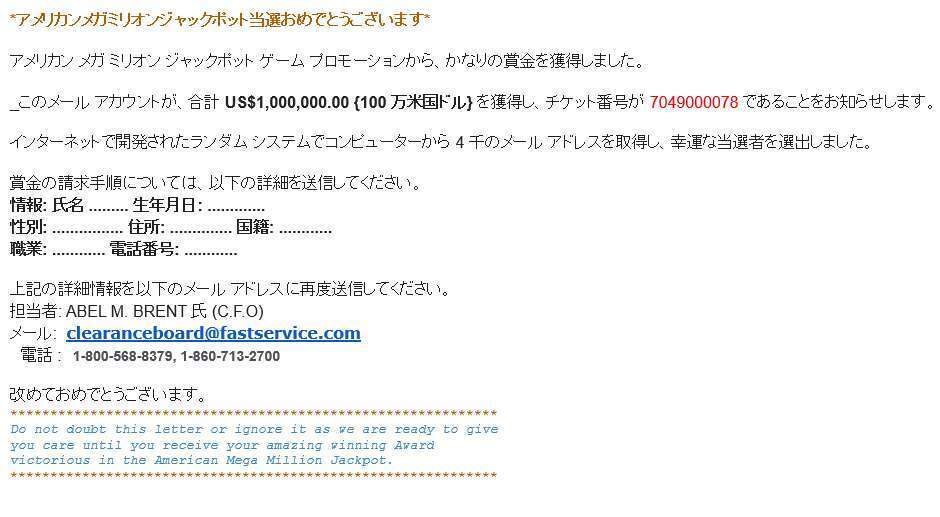 アメリカンメガミリオンジャックポットに当選しました!! チケット番号は7049000078です。イヤァ、神様っているのですね。真面目にコツコツやっていると良い事があるもんです。。 って、なるかぁ!!