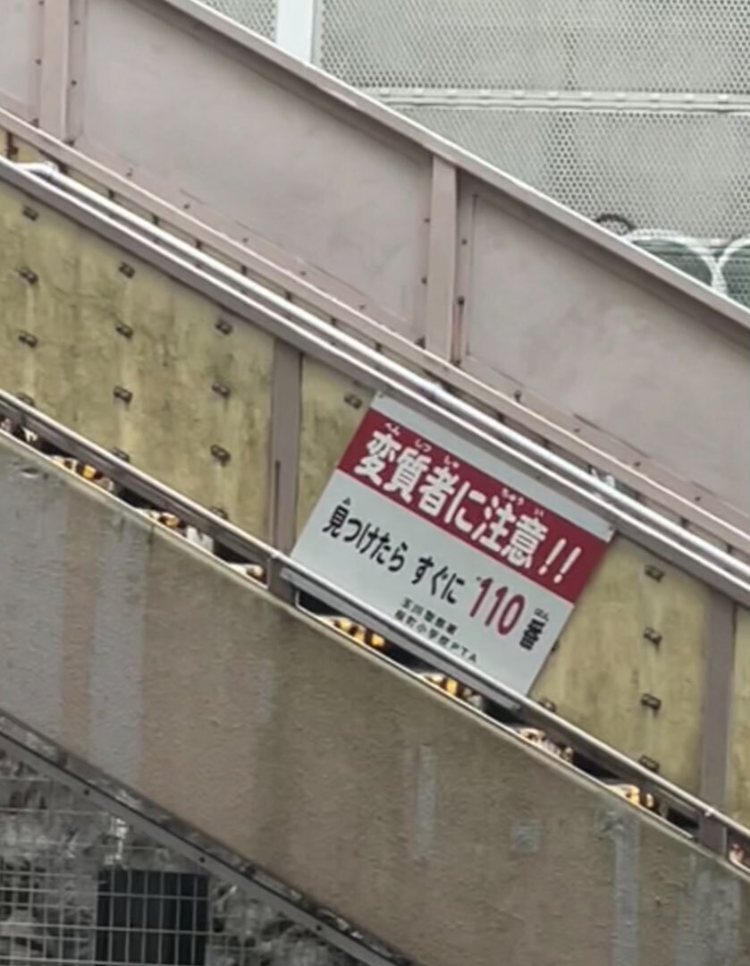 通勤途中の246、大昔から気になっていた歩道橋があります。左にも右にも、階段上り切った場所にも同じ表示板があります。どんだけ危険なんだ。