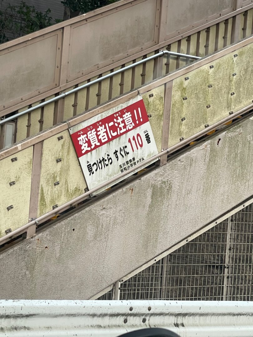 怖くて私でも通行出来ません。。もはやこの歩道橋に住んでいるのではなかろうか。深夜なんかに渡ったら何人もの。。。怖すぎる。。。で、もしこの歩道橋を通って変質者に遭遇しました。110番しました。としてもよ、だから注意しなさいってあれほど言ったのに。。なんて冷たくあしらわれるのではなかろうか。。誰かYoutubeかなんかで、「変質者に注意!!な場所で変質者に遭遇してみた」とかやってくれないかしら。 触らぬ神に祟りなし。本日もくれぐれもご健康でご安全に。
