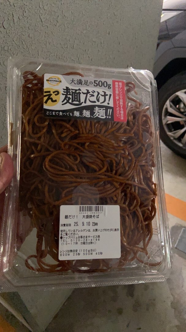 でこちら。あちらこちらの激安店で見かけるようになりましたが、「麺だけ焼きそば」。これが昔から欲しかった。。十代の頃から、自炊の中心は3食パックの袋に入ったマルちゃん焼きそば。もちろん野菜やら肉やらなんて気の利いた事は出来ません。簡単にサッと食べられる焼きそばに具は無しでした。。若い時には3食分を一気に食べたり。これが至福の時だったんですよね。そんな青春時代を過ごした私からすると、これこれ。これが欲しかった。な商品。大満足の焼きそばです。後大好きなのはペヤングとサッポロ一番。この3種(カップ・インスタント・蒸し麺)で育ったと言っても過言ではない。ペヤングが大盛りを出した時も涙が出るほど嬉しかったのを思い出します。ちょっと足りなくて2個同時に食べたりしてたもんなぁ。。本日もくれぐれもご健康でご安全に。