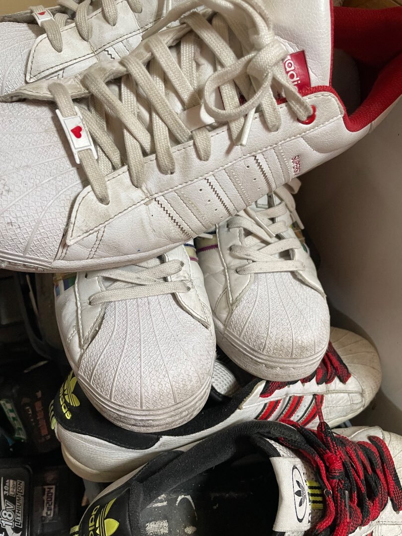 最近履き潰したスーパースターの数々。。安全靴ではありませんが、先端のトウの部分がしっかりしているので他のモデルより安心です。スタンスミスじゃダメなんですよ。。ちょっとレアなコラボモデルやアニバーサリーモデルをヤフオクで探すのも楽しみの一つ。一点物との出逢いは奇跡なのです。あ、でも靴は1万円以内。と決めているので高価なレア物ではありません。ガンガン履き潰す作業靴ですので。色はホワイトベースに差し色が入ったモデルがお気に入り。気に入らないモノを身に纏うとテンションも下がりますし、作業効率も良くない。 お花見日和の日曜日。今日もお気に入りのスーパースターで現場にレッツラゴーです。本日もくれぐれもご健康でご安全に。