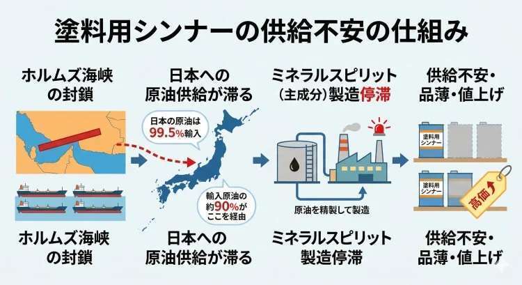 シンナーが無い。米国とイスラエルによる2026年2月28日のイラン攻撃から、イラン情勢は急速に悪化し、日本が使う原油の大半が通過するホルムズ海峡が事実上封鎖された影響で、製造大手の日本ペイントは、シンナー類全般を対象に、3月19日発注分から75%の値上げを実施した他、市中の店舗では塗料用シンナーが品薄で入手困難になっています。というよりも、今後の入荷が読めない状態です。
