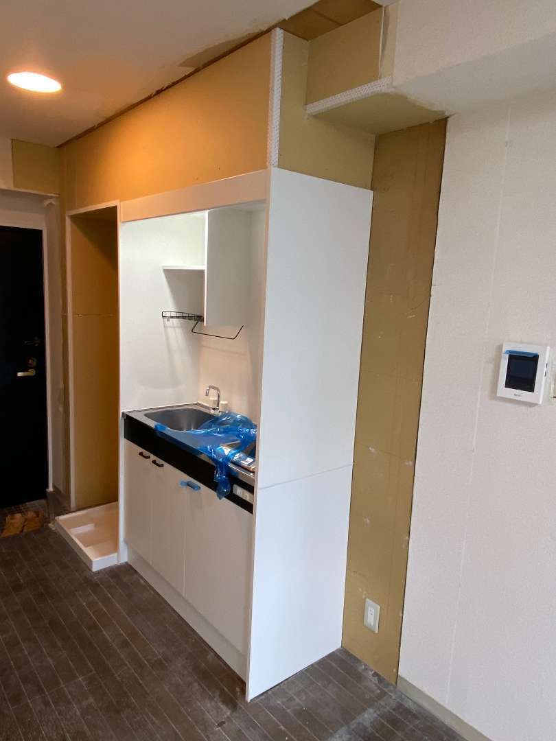 先日の続きです。最終の電気工事を行いました。事前に配線(通線)していた箇所に器具取付です。何もなかったところにミニキッチン設置出来ました。残るは床・壁ですかね。その他、出窓の面台にシート貼。