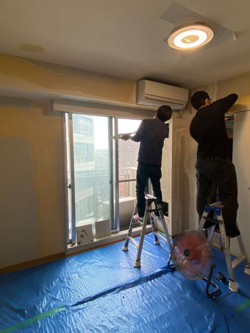 お部屋の荷物(不用品含む)を移動させて、養生をします。既存の壁紙を剥がして下地処理をしている画像です。段々と寒くなってきましたので、パテの乾燥に時間が掛かる季節になりました。。乾燥を早める為に扇風機を使い風を送っています。更に寒いです。。