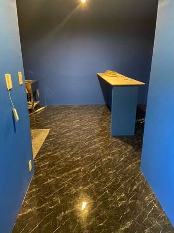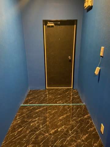 壁・床を貼りました。先日塗装した窓や扉枠とシート貼りした玄関ドアも含めてやっと「BLACK&BLUE」の世界が生まれました。001から見返していただくと、その変貌ぶりが分かっていただけると思います。こんな色合いは一般のご家庭でも、リビングやお子様のお部屋などでも使っていただけると思うのでご参考にしてみてください。アクセントクロスとして一面だけをBLUEにするなどバリエーションはいっぱいあります。
