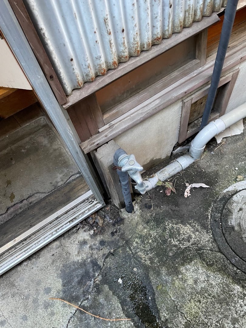 当時の立水栓?排水管は剥き出しです。今回はメーターからの配管を全て交換します。この漏水は水道局からの指摘で判明した事例です。入居者がおらず、使用していないのにメーターが回っている。どこかから漏水しているので直してください。そうしないと水使えません。と。入居も決まりましたので、緊急工事です。そんな日曜日。本日もご安全に。