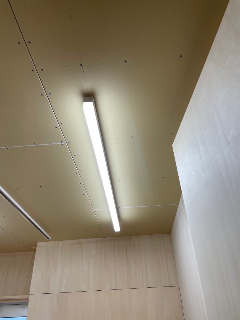 最終的に見えない部分(壁や天井内)の配線や配管が重要な電気や設備にはない作業です。器具はもろ見えですが。そんな大事なパテ打ち・下地処理をして、この木の壁と石膏ボードの天井がどう変わるのか!完成をお楽しみに。