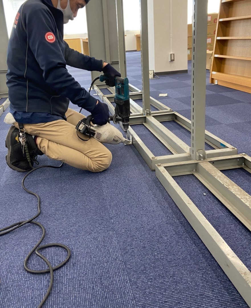 最終日!ラックの組立が終わり、配置が決まったら、床固定します。ひたすら穴を開けて・アンカー打ち込んで(オールアンカーを使用)締めます。この後に棚板を戻して、作業終了。なかなかタフな現場したが、頑張りました。