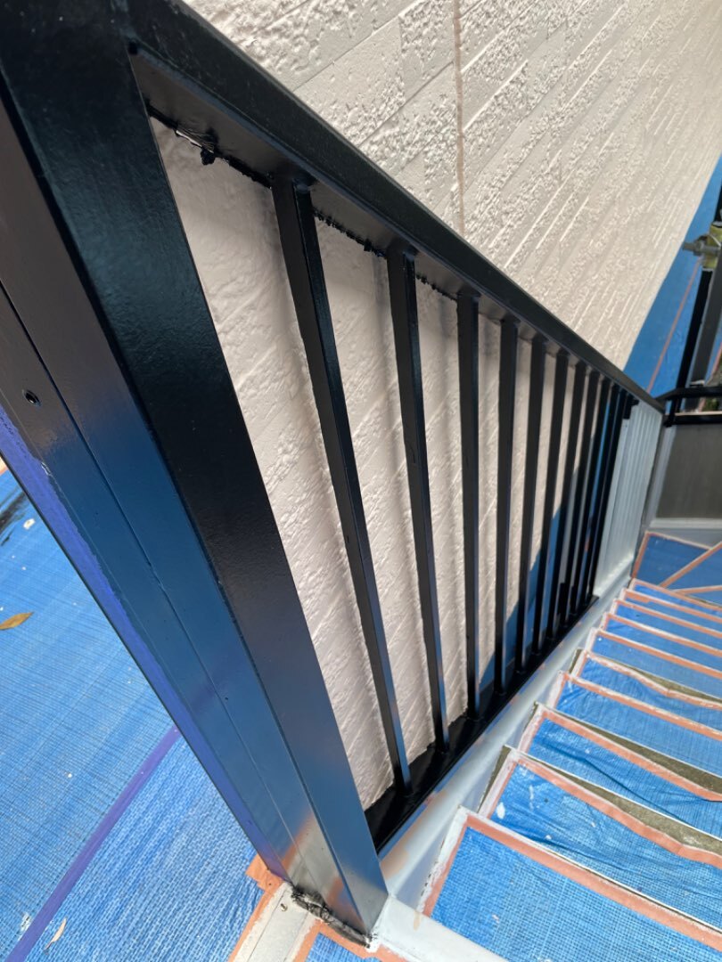 鉄部はハイポンファインプライマー2(錆止め)を塗って、黒の3分艶を2度塗りです。画像の白い部分が錆止め部分。外壁は画像よりもっとピンクがかった色合いです。お色の選定はお客様ですが、細部の塗り分けは決めさせていただきました。今週には足場を撤去し、全体が見れるようになります。薄いピンクの外壁に鉄部の黒がアクセントになって、雨樋のラインがスーっと黒く。。僕自身も楽しみです。早く雨上がれ!!