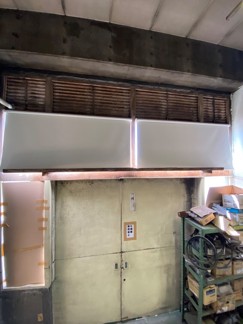 昨日は、大田区の工場にてロールスクリーン取付作業でした。こちらもやはり暑さ対策です。猛暑の影響で何としても日差しを遮らねば。 とりあえず、右側だけ紙貼って凌いでいた状態でした。いよいよ今年は耐えられません。ということで、