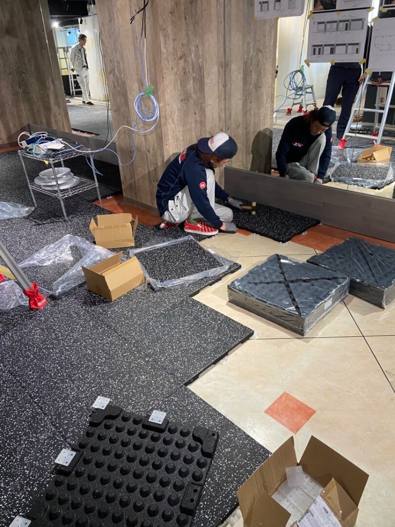 先月の作業報告です。横浜市にてラバータイル貼り作業をしました。BSラバータイルは<500mm×500mm 置き型・厚手硬質ゴム床>厚さ20mmから50mmと大変厚くまた硬質で沈み込みが少ないので、ジムのフリーウェイトスペースに最適です。また置くだけで、プラスチックコネクターでジョイントするタイプなので、接着できない貸しテナントにも適しています。