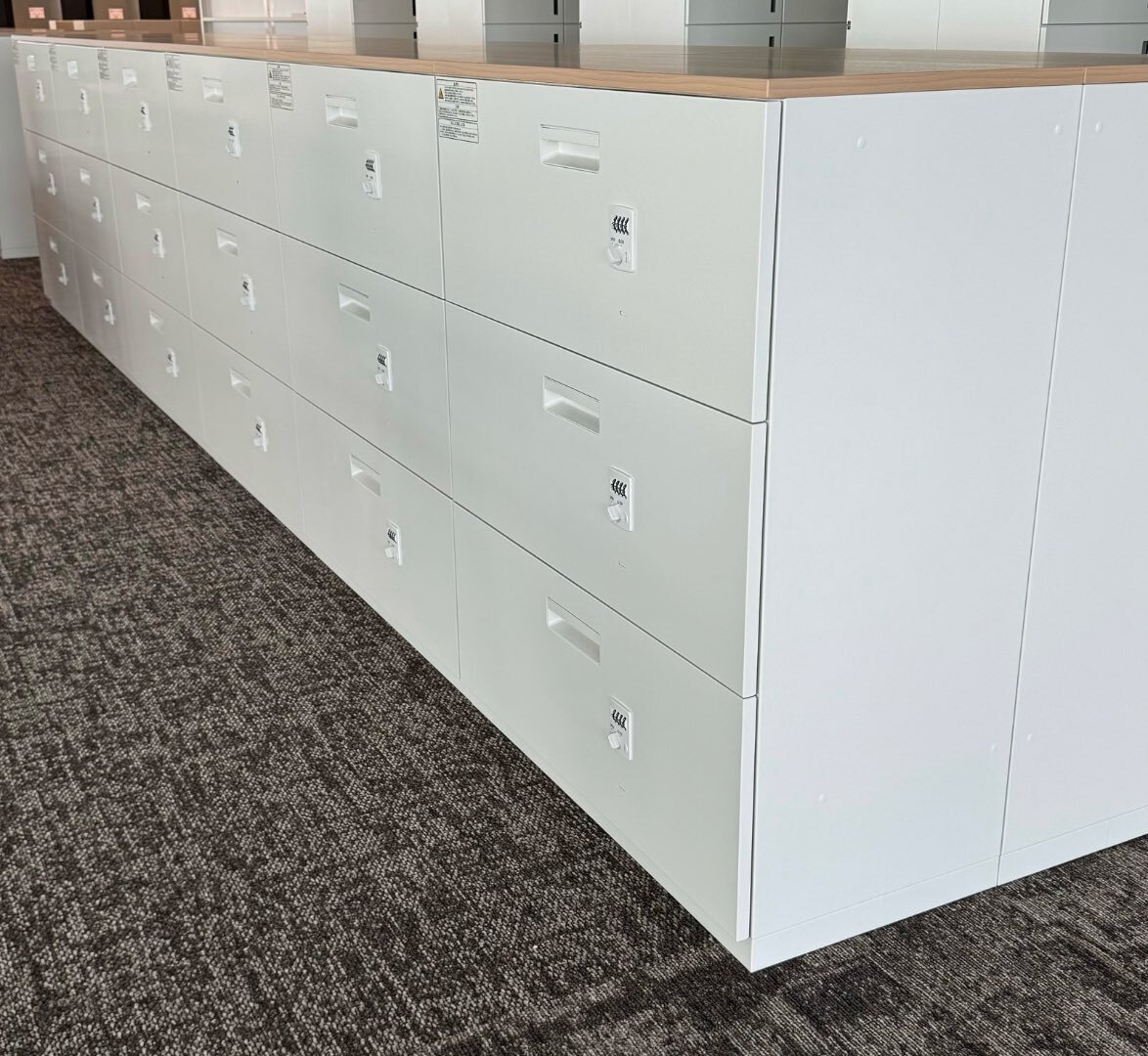 こちらはダイヤル錠付のローキャビネットラテラルタイプ。天板付で前後12台。背中を合わせて並べますので、「背合わせ」と言います。そして、このかたまりを「島」という単位で表します。ロー12台背合わせの1島、なんて。横並びは「連」3本並べば3連。ひとつだけのモノは単体。なんて言ったりします。 ダイヤル錠も増えてきましたね。世の中から「鍵」が減ってきているんですね。 無駄に色んな鍵をジャラジャラ腰に付けていた若かりし頃を思い出し、甘酸っぱい気分の水曜日。本日もくれぐれもご健康でご安全に。