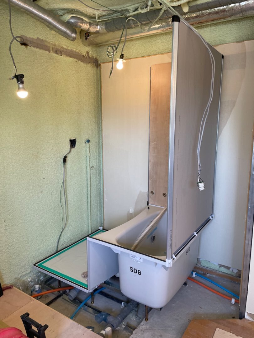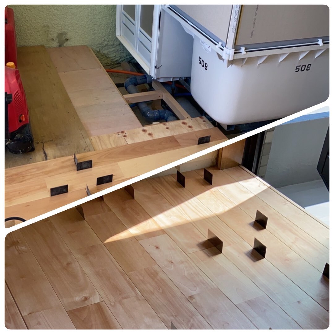 ユニットバスが入りました。お二人の職人さんでチャチャッと半日作業。ここが決まらないと色んな取り合いが決まらないので助かりました。なので、午後からはフローリング貼りです。