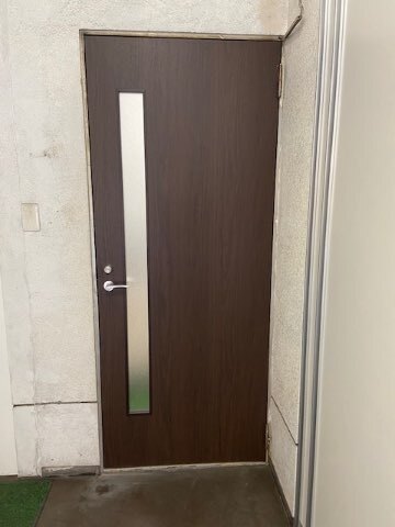 裏口エントランス化作業の続きです。カバー画像の奥に薄っすらと見えるサッシ扉を交換しました。昔ながらのガラス入りサッシドアを木目調内装ドアへ変更、床の長尺シートと色味を合わせています。既存枠を利用してのオーダーメイド制作+丁番やラッチ部分は現場加工で納めました。