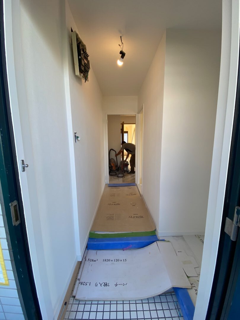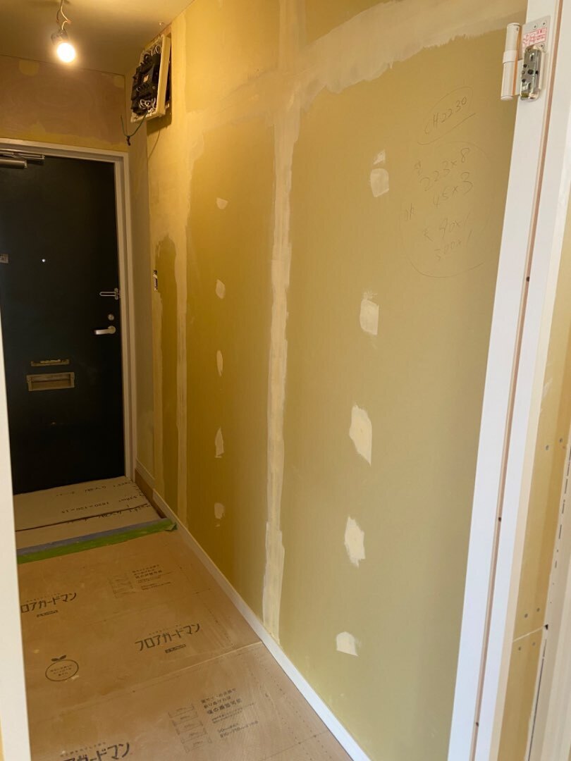 青葉区は壁紙貼り始めました。下地処理(パテ埋め)をしっかりと行い、貼っていきます。中から撮った画像と玄関からの画像です。クロスを貼りだすといよいよ終わりが近づいてきた感じがします。日々相変わらずの暑さ、、扇風機フル稼働で頑張っています。