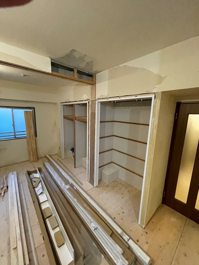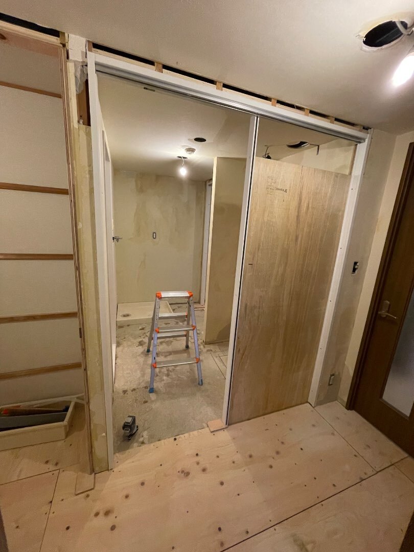 ひっそりこっそり荒川区賃貸リノベーション工事も進めております。床の捨て貼りが終わりましたので、建具を設置していきます。毎度の事ですが、リノベーション工事ですので、既存の壁や床などとの折り合いをどうつけていくのか。いけんのか。いけないのか。。試行錯誤の日々です。壁は曲がっていますし、床も水平ではありません(レベルが取れていません)。。