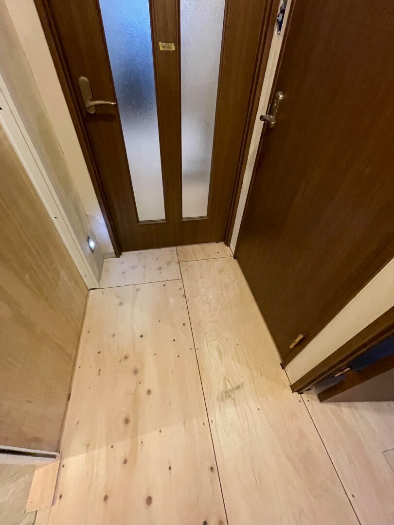 新たな建具を設置する場所もあれば、既存建具を利用するところもあります。床は既存の床に捨て貼りをしてから新しいフローリングを貼ります。 と、なると、。床はおよそ20mmほど上がる事になり、既存のドアは床に当たってしまいます。