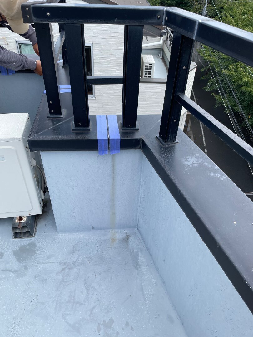 先日の塗装+シーリング作業の模様です。屋上の笠木・水切り金物の継ぎ目をシーリングします。これはどちらかというと予防に重きを置いた工事です。雨水の侵入を防ぎ、周りの部材素材を長持ちさせる効果があり、漏水を防ぎます。