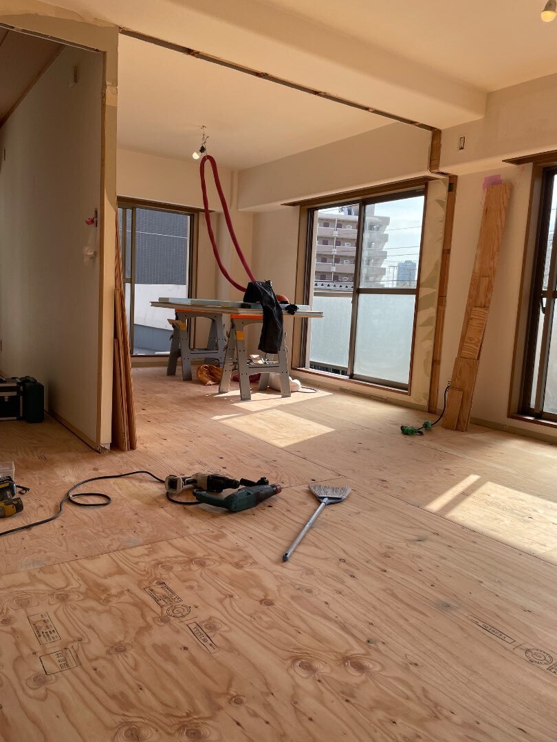 昨日から、大田区でのリノベーション工事が始まりました。解体済みの現場ですので、床工事からスタートです。長らくワンルームの工事が続いていましたが、今回は4LDKを巨大な3LDKにする工事です。ワンルームの床工事の大変さは何度か書いていますので、大変さはお分かりいただけていると思います。その点、こんなに広い現場ですと加工場や資材置き場が選び放題の置き放題。とっても作業がしやすく快適です。暑いことを除けば。。