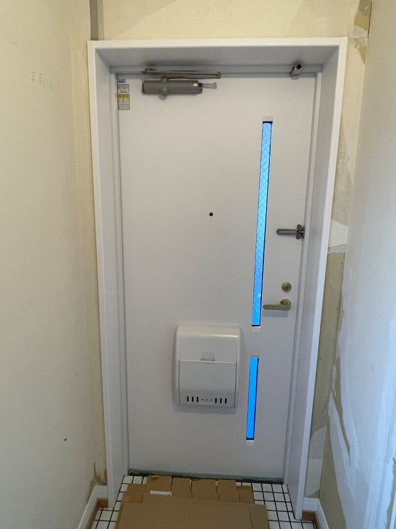 大田区のリノベーション現場、塗装とシート貼りが終わりました。玄関は、ポストとSD枠が塗装。木枠とドア内側がシート貼りでの仕上げです。