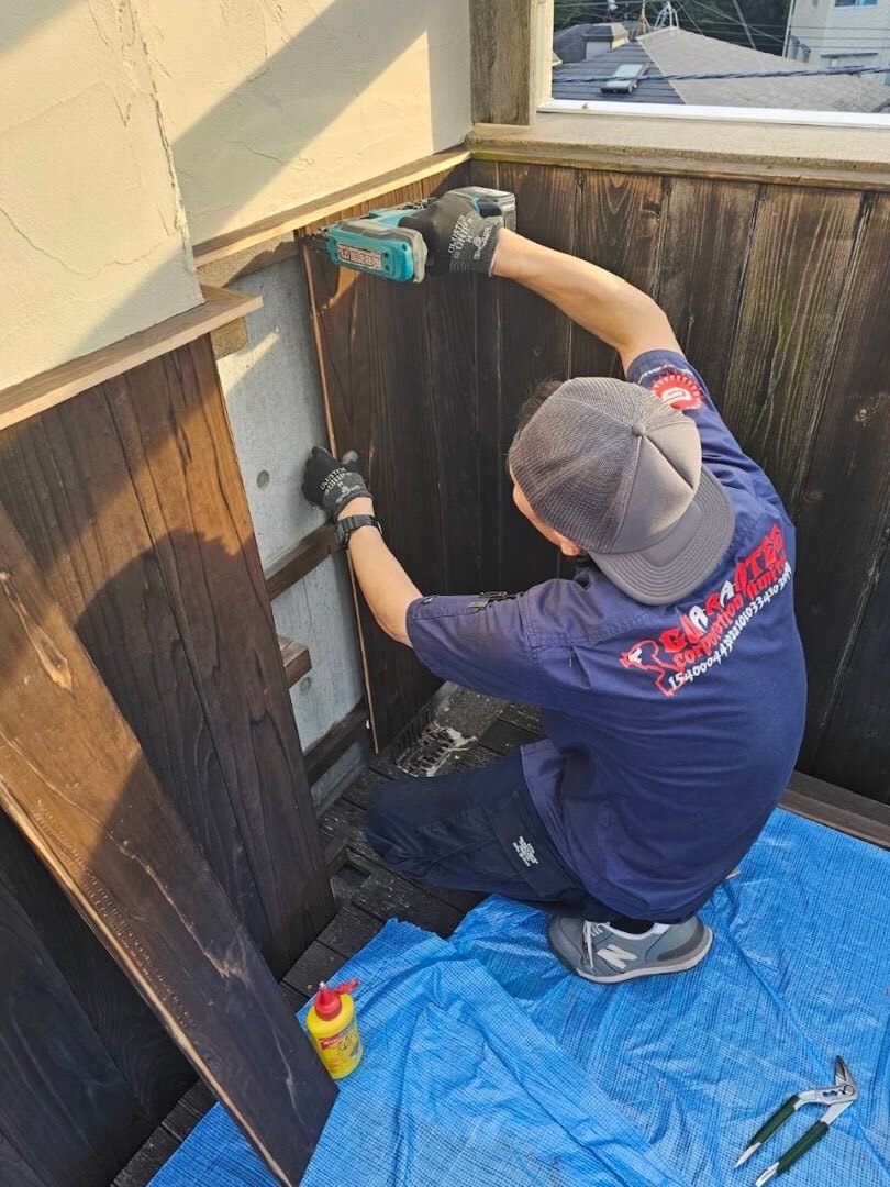画像上部の下地は腐食が酷い為取り替えてあります。腐食保護塗装もしました。漢字がいっぱい。。材料は外壁用の焼杉を使用。焼杉(焼き杉板)は、杉板を焼いて表面を炭化させた商品です。表面の炭化層が、板の劣化を遅らせます。愛媛県や瀬戸内海の島々などの西日本では古くから焼杉が家の外壁に使われてきました。焼き方にも種類があって、こちらは「バーナー焼き」です。バーナーの火で“あぶる”という感覚に近いため触っても黒くなることはありません。本格的な「三角焼き」で作られるような焼杉とは違いますが、既存壁と合わせています。作業中は半袖になりますが、朝晩は冷え込み服装の調整が難しい季節です。本日もくれぐれもご健康でご安全に。