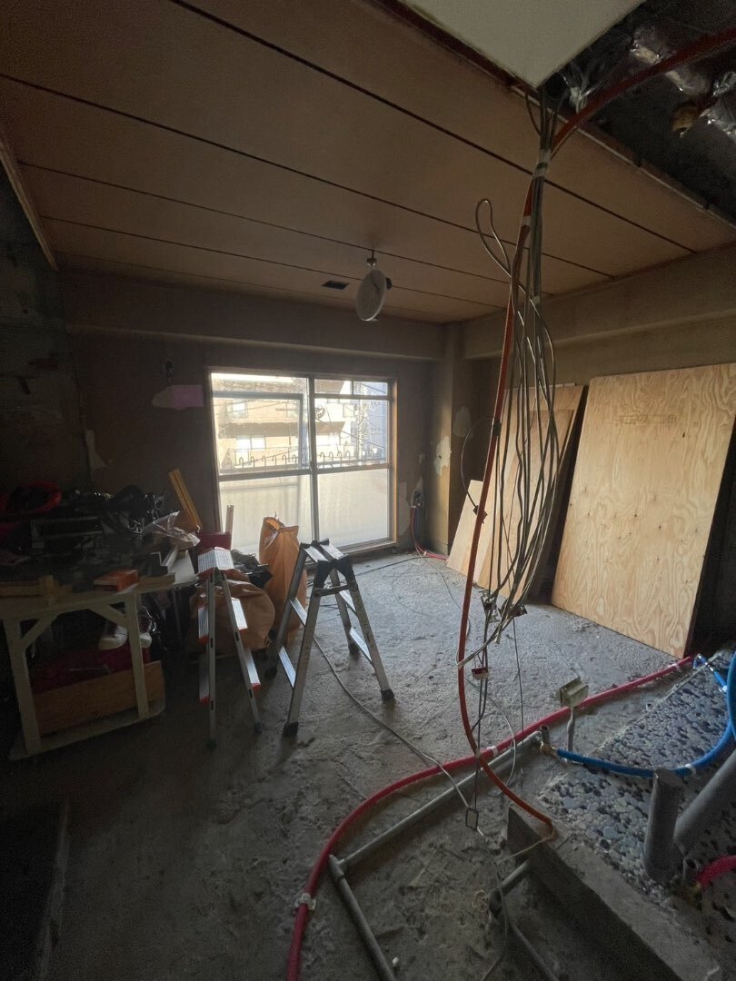 中野区で新たなリノベーション工事が始まりました。今回はほぼスケルトン?な状態まで解体しています。畳仕様のちょっと古めの物件で大掛かりなリノベーション工事になりそうです。ガスの使用を止めていたお部屋ですので、新たに給湯器を設置します。