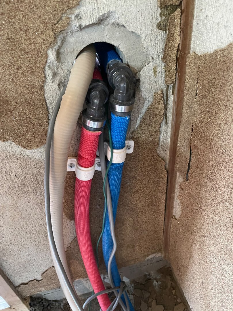 コア抜きをして、給湯・給水・ガス・電気の管や線をベランダへ通します。今では当たり前の屋外給湯器ですが、昔は室内にあるのが当たり前でした。室内にあると、一酸化炭素中毒や火災につながる危険性も多くなりますし、 給排気設備に不備があると、一酸化炭素(CO)中毒を起こすおそれもあります。その為今では屋外に設置する事が一般的になっています。マンション規約などで、コア抜きやベランダ(躯体)への設置が制限されている場合もありますが、最近では安全性が優先されて許可されているケースが多いです。そして、画像の通り壁は砂壁仕上げ。さて、やることいっぱいです。本日もくれぐれもご健康でご安全に。