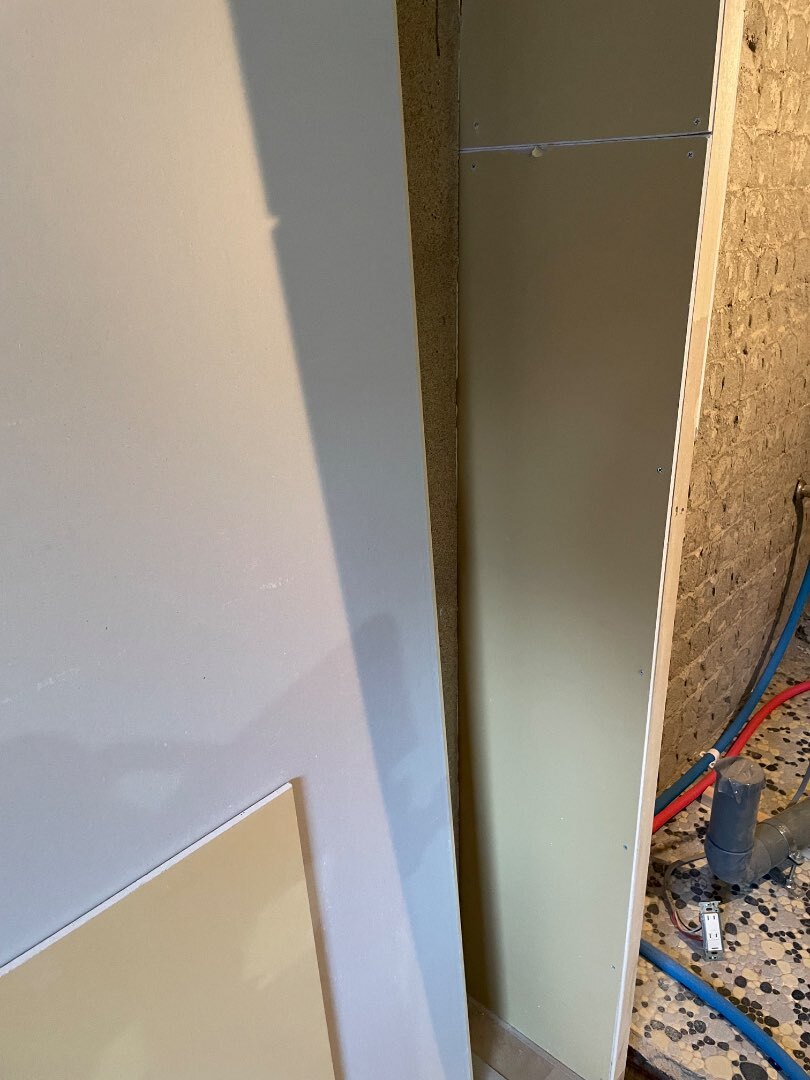 さてさて、PB貼作業です。PBとは、お馴染みの?業界用語、プラスターボードの略で石膏ボードの事を言います。アナタも「石膏ボード?あ、PBね。」なんて通っぽく言ってみませんか?そんな機会滅多に無いか。お見積りなどには出てくる言葉ですので、覚えておいて損は無し。PB12.5×2とか、PB9.5とか出てきます。