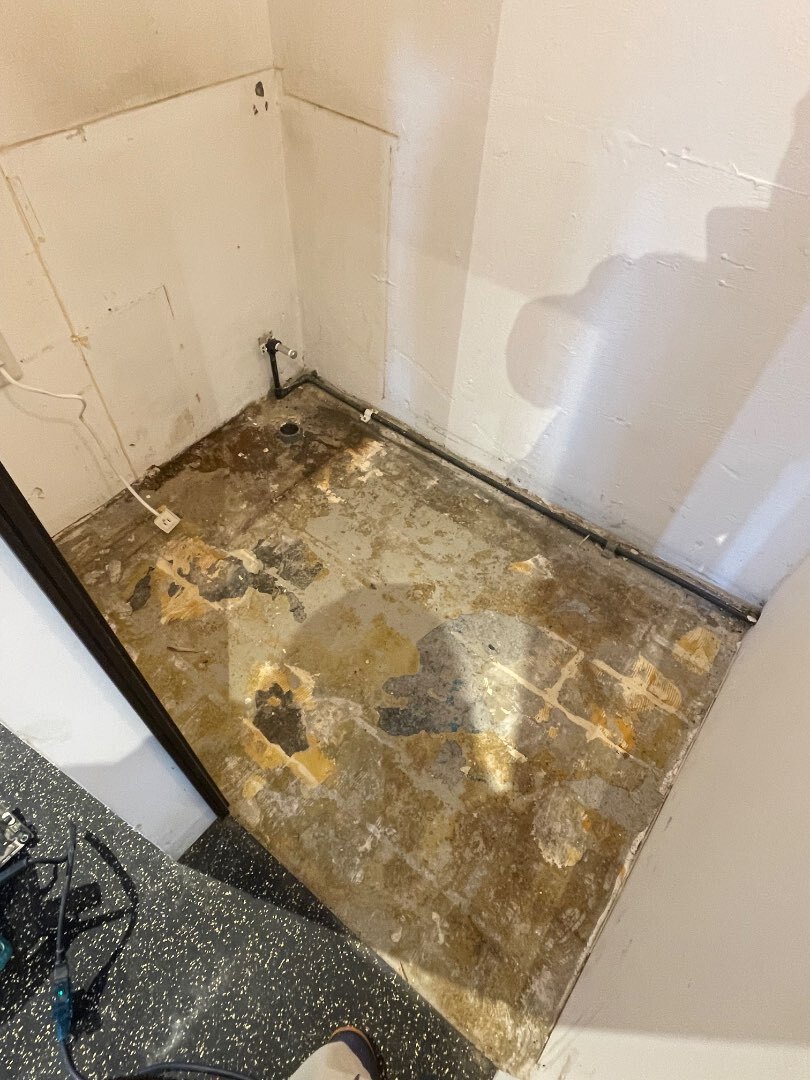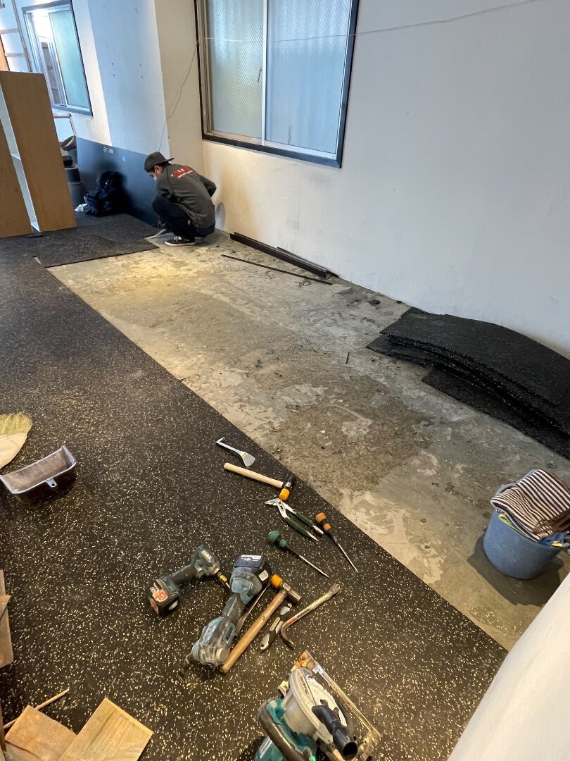 いつも貼っているラバーマットの剥がし作業を行っています。貼るのも大変ですが、剥がしも大変です。重たいマシンが乗っていましたので、しっかりガッツリ接着されています。。剥がれないように施工していますので当然ですよね。。