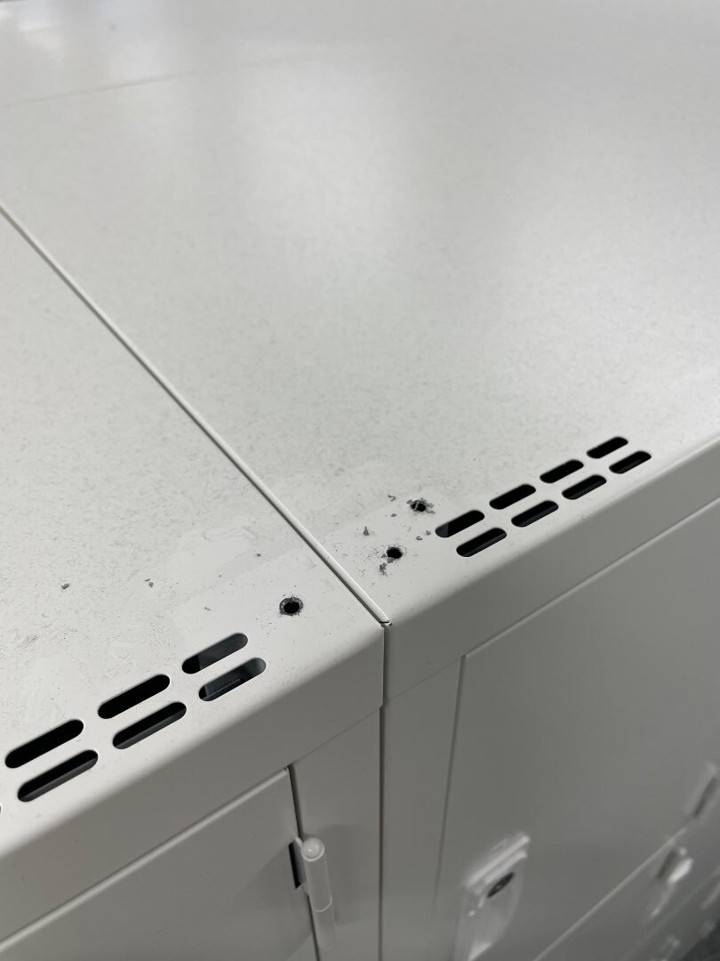 今回は上部を金属製のプレートで繋いでいました。ちょっと汚いですが、金具を取り外すとこんな感じです。3点ピアス(テクス・鉄板ビス)で留めてありました。内部の穴を使ってボルトナットで固定したり、上部の前面や下面でプレート固定したりもします。ロッカーはアジャスターが付いていない商品が多いのも特徴です。高さやレベルの調整が出来ない仕様になっています。床の不陸を拾ってしまいますので、高さが合わなかったり、前後に倒れたりしてしまいます。そんな状態での横連結は腕の見せ所となります。面を綺麗に合わせて(合うように微調整をしながら)横連結を行います。今朝も茨城で地震がありました。地震大国ニッポン。家具の固定はお済ですか? 少しでも逃げる時間を作るために、壁面固定をおススメします。寒い月末日曜日。本日もくれぐれもご健康でご安全に。